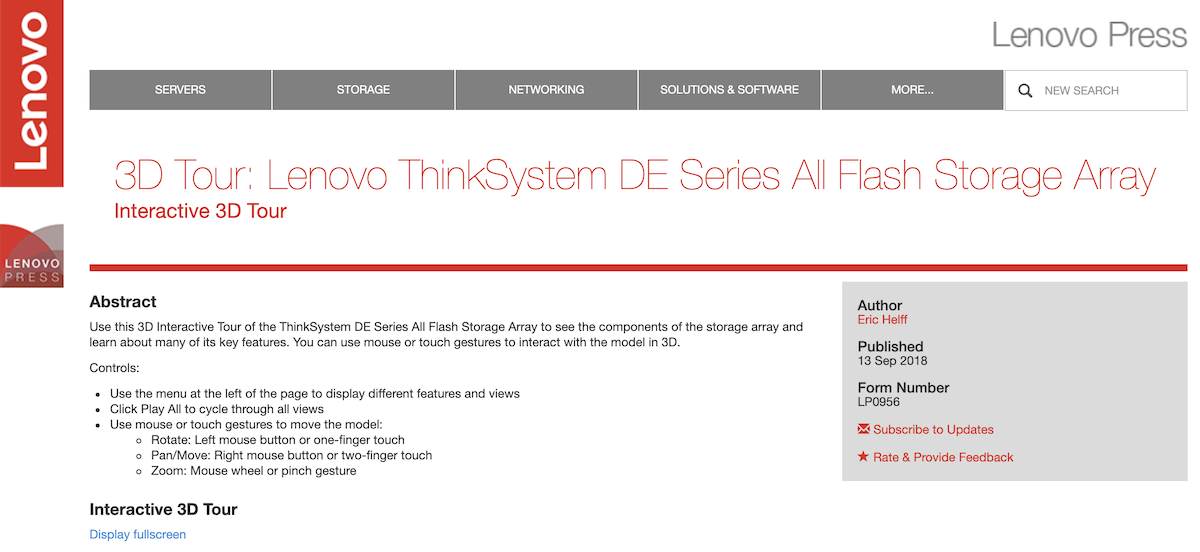 This web page offers an engaging and informative interactive 3D tour of the Lenovo ThinkSystem DE Series: All-Flash Storage. It provides an overview of the ThinkSystem DE Series and lists its benefits. It illustrates the DE4000F and DE6000F models, shows how the configurations can be expanded, discusses storage management, and describes Lenovo XClarity. Please contact Computer Hardware, Inc. for more information about the Lenovo ThinkSystem DE Series: All-Flash Storage.